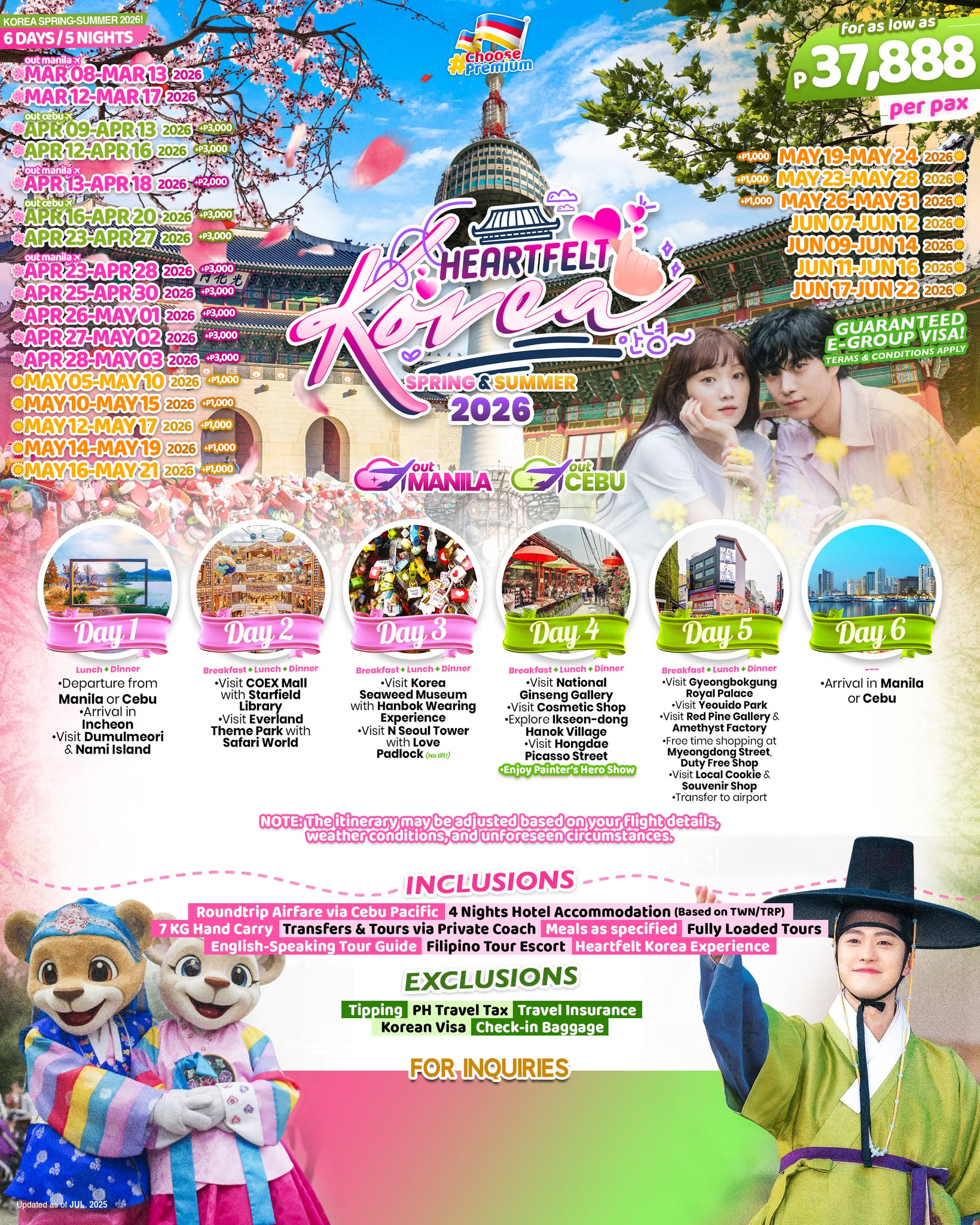 Previous Product Next Product Korea Spring & Summer 2026 – [6 Days 5 Night] ₱37,888.00 Korea Spring & Summer 2026 - [6 Days 5 Night] quantity Add to cart Categories: International Tours, South Korea Related products International Tours, JapanTokyo or Osaka 2025-2026 – [5 Days 4 Nights] ₱62,221.63 Add to cart International Tours, JapanTokyo to Osaka 2025 – [8 Days 7 Nights] ₱113,691.73 Add to cart International Tours, South KoreaKorea Winter 2025-2026 – [6 Days 5 Nights] ₱37,888.00 Add to cart